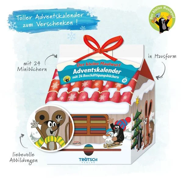 ...es muss ja nicht immer Schokolade sein. Das liebevolle Adventskalenderhaus mit dem kleinen Maulwurf steckt voller bunter Mini-Bücher zum Basteln, Malen und Entdecken.
