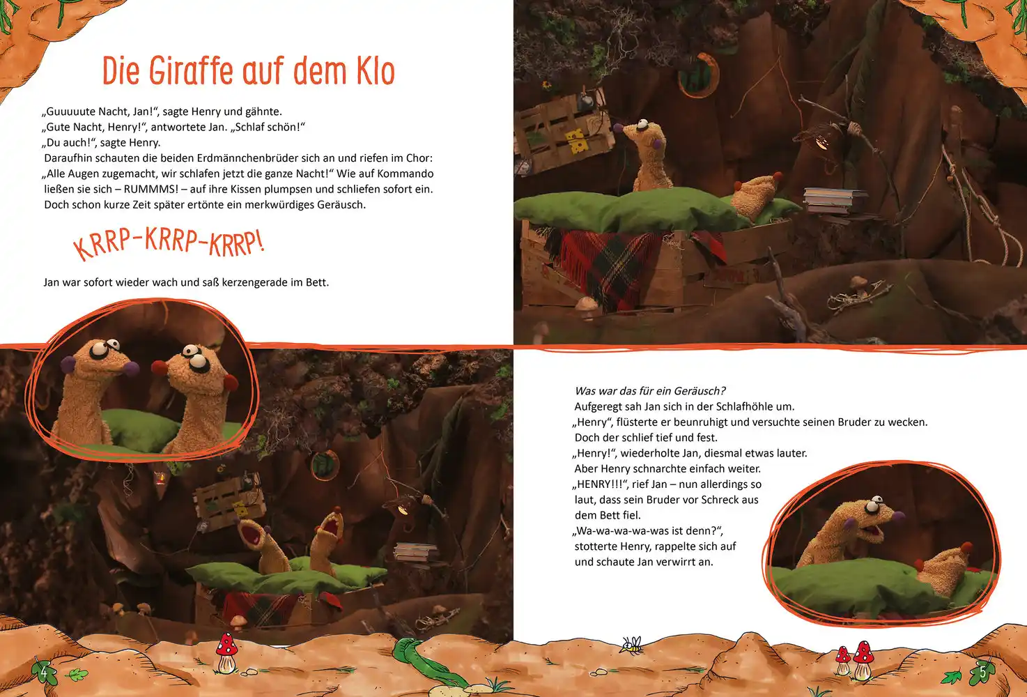 Kaum wollen Jan und Henry schlafen, da wird’s wieder spannend! Seltsame Geräusche wecken die beiden Erdmännchenbrüder aus ihren Träumen. Ist das etwa eine Giraffe mit Schluckauf auf dem Klo? Oder eine Königin mit klappernder Schubkarre?
