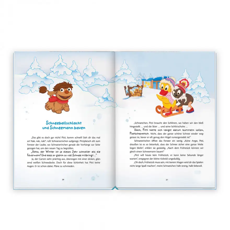 Zum Vorlesen und Einkuscheln! In diesem liebevoll gestalteten Buch warten 12 farbenfrohe Wintergeschichten mit dem Sandmännchen und seinen Freunden. Pitti, Schnatterinchen, Moppi sowie Herr Fuchs und Frau Elster erleben viele kleine Abenteuer im Schnee – vom Winterdienst bis zum Eisfischen.