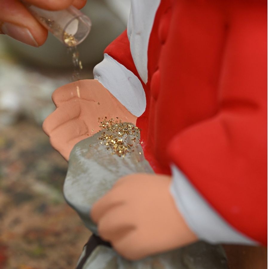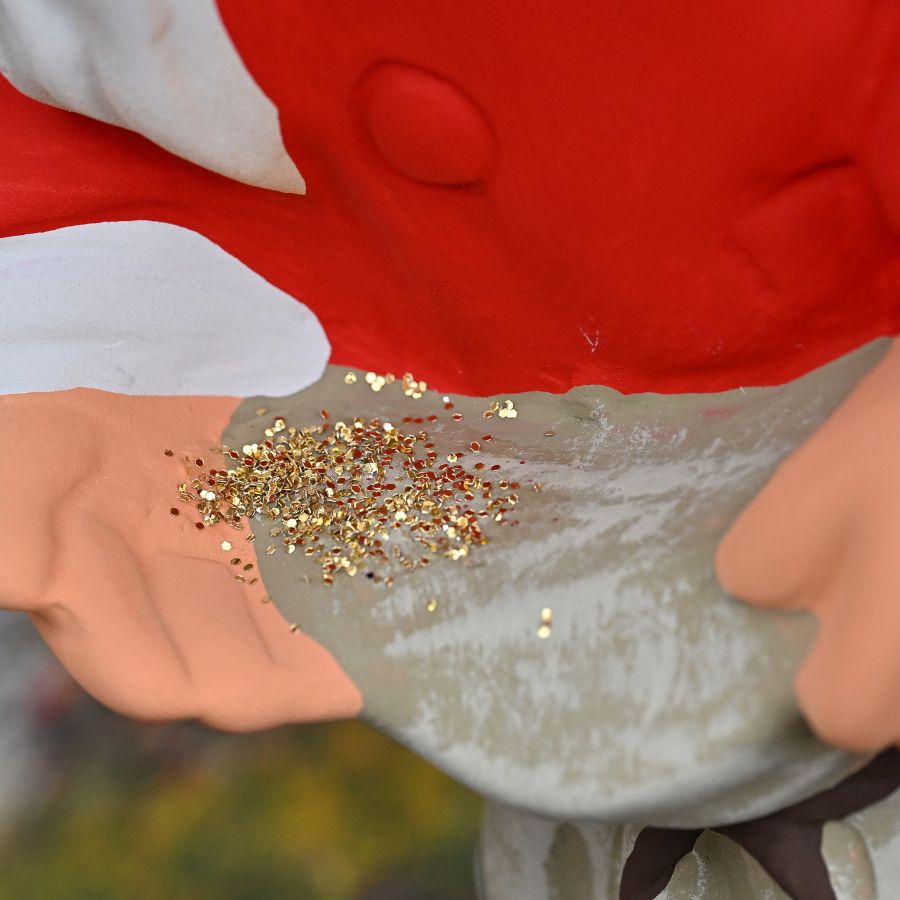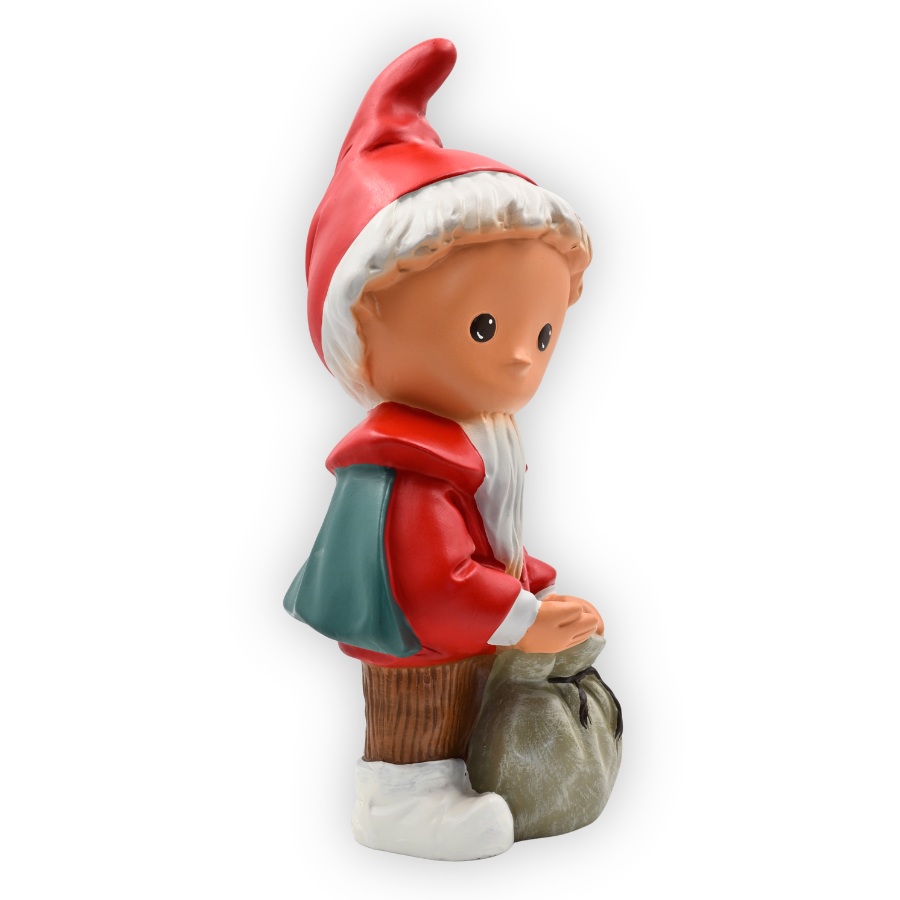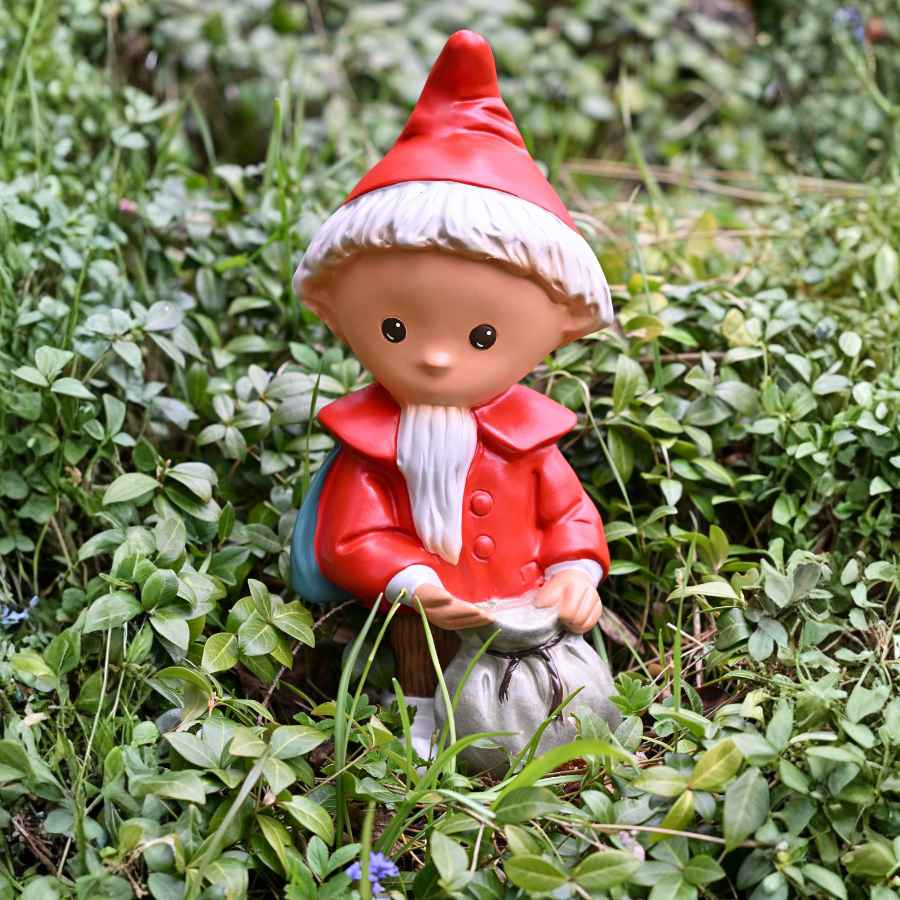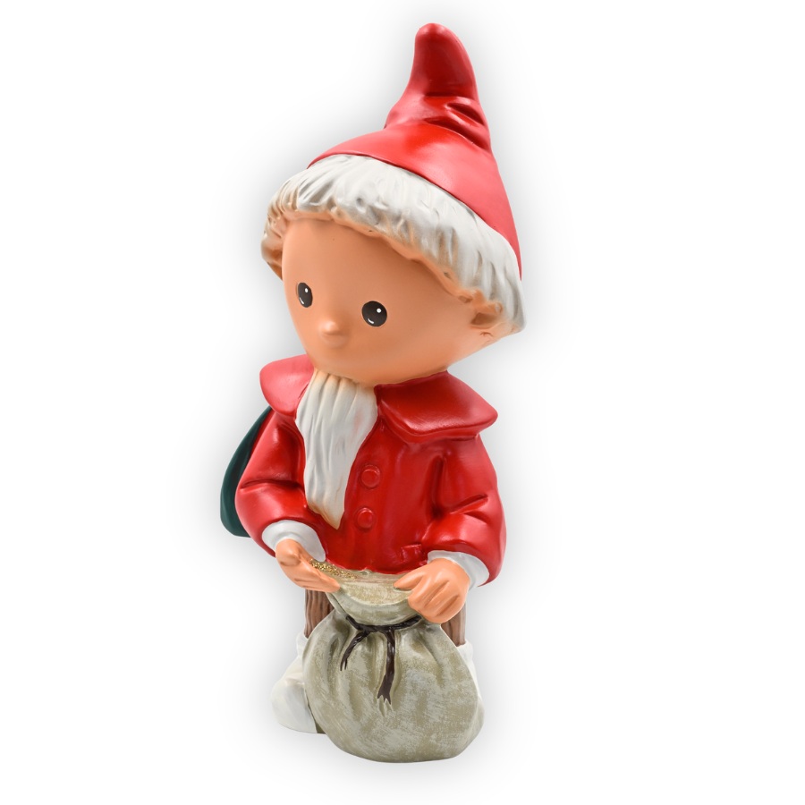 Am Abend wird es ruhig im Garten. Zwischen Blumenbeeten und Gartenwegen sitzt das Sandmännchen mit freundlichem Blick. Vor ihm steht ein kleiner Sack gefüllt mit Traumsand – erkennbar an dem feinen und sorgfältig angebrachten Glitzerstaub. Dieser liebevoll gestaltete Gartenzwerg bringt als Sandmännchen ein Stück vertraute Kindheit in jeden Wohlfühlort.